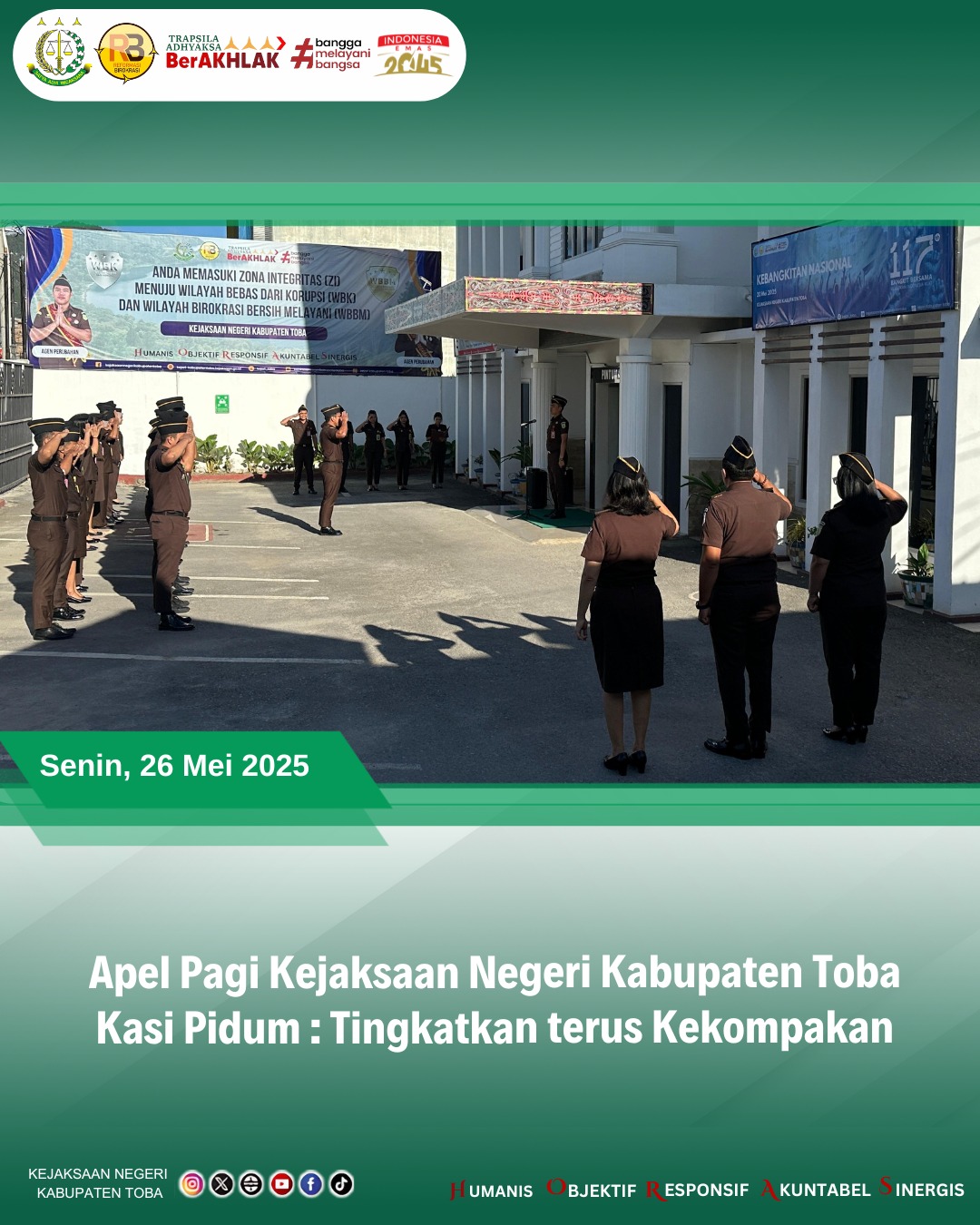 Apel pagi yang berlangsung tertib dan penuh semangat ini mencerminkan komitmen jajaran Kejari Toba dalam meningkatkan kualitas pelayanan kepada masyarakat serta menjaga integritas institusi penegak hukum tersebut.